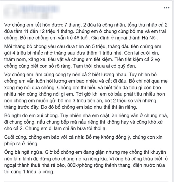Nguyên văn chia sẻ của B.N: Vợ chồng em kết hôn được 7 tháng. 2 đứa là công nhân, tổng thu nhập cả 2 đứa tầm 11 - 12 triệu/ tháng. Chúng em ở chung cùng bố mẹ và em trai chồng. Bố mẹ chồng em vẫn trẻ, 46 tuổi. Gia đình ở ngoại thành Hà Nội. Mỗi tháng bố chồng yêu cầu đưa tiền ăn 5 triệu, tháng đầu tiên chúng em gửi 4 triệu bị nhắc nhở tháng sau đưa thêm 1 triệu nhé. Còn lại cưới xin, thăm nom, xăng xe, tiêu vặt và chúng em tiết kiệm. Tiền tiết kiệm cả 2 vợ chồng cùng biết con số rõ ràng. Tạm thời chưa ai có quỹ đen. Vợ chồng em làm cùng công ty nên cả 2 biết lương nhau. Tuy nhiên bố chồng em vẫn luôn hỏi lương em bao nhiêu và cất đi đâu. Bố chỉ nói qua mẹ xong mẹ nói qua chồng. Chồng em thì hiểu và biết tiền đã tiêu gì, còn bao nhiêu nên cũng không nói gì em. Tới giờ khi em có bầu phải tiêu nhiều hơn nên chồng em muốn gửi bố mẹ 3 triệu tiền ăn, bớt 2 triệu so với những tháng trước đây. Do đó bố chồng em bảo như thế thì ăn riêng. Bố nghĩ do em xui chồng. Tuy nhiên nhà em chật, ăn riêng vẫn ở chung nhà, đi chung cổng, nấu chung bếp mà nấu riêng thì không hay và cũng khó xử cho cả 2. Chúng em đi làm chỉ ăn bữa tối thôi ạ. Cuối cùng, chồng em bảo với cả nhà: Bố mẹ không đồng ý, chúng con xin phép ra ở riêng. Ông bà ngã ngửa. Giờ bố chồng em đang giận nhưng mẹ chồng thì khuyên nên làm lành đi, đừng cho chúng nó ra riêng kìa. Vì ông bà cũng thừa biết, ở ngoại thành thuê nhà rẻ bèo, 800k/phòng rộng thênh thang, điện nước nữa thì cũng 1 triệu là cùng. |