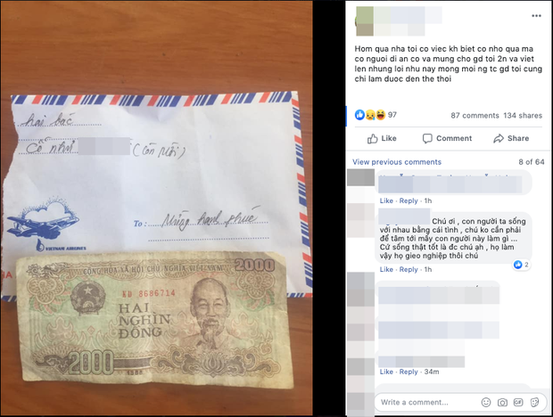Chia sẻ trên trang cá nhân, tài khoản O.H viết, "Hôm qua nhà tôi có việc, không biết là cỗ nhỏ quá mà có người đi ăn cỗ và mừng cho gia đình tôi 2 nghìn và viết lên những lời như này. Mong mọi người thông cảm, gia đình tôi cũng chỉ làm được đến thế thôi".