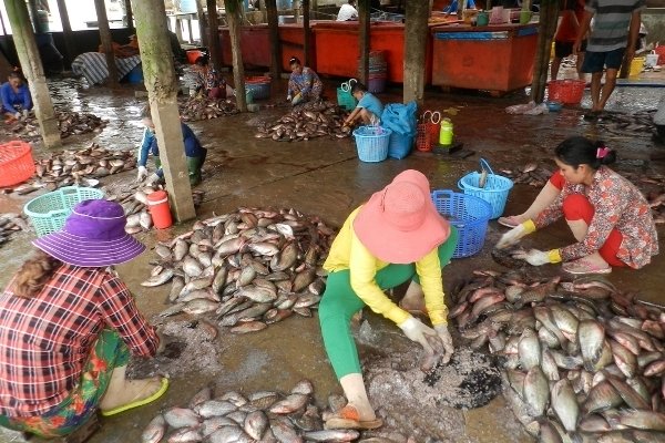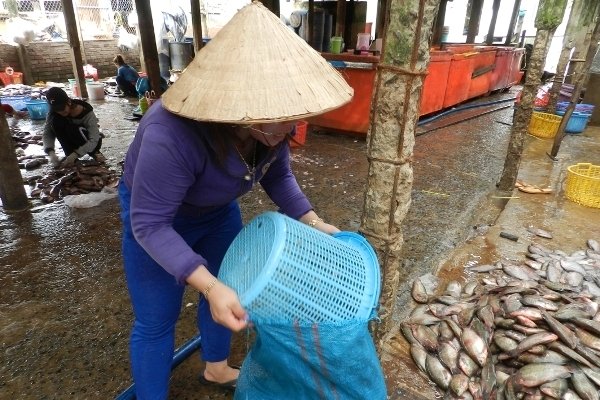 Tay họ liếng thoắng quét và đổ vảy cá vào sọt. Thỉnh thoảng họ lại bê sọt chứa vảy cá đổ vào bao (loại bao chứa lúa). Dọn sạch vảy ở điểm mần cá này, họ liền đến điểm khác. Cứ thế, những bao vảy cá được chất tại cơ sở chế biến khô chờ người đến mua chở đi.