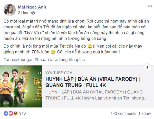 “Có một loại mất trí nhớ mang tính lựa chọn: Rốt cuộc thì hôm nay mình đã ăn chưa nhỉ, ôi gần đến Tết đồ ăn ngập cả nhà, không biết làm sao để bảo toàn cái eo qua tết đây? Và dĩ nhiên là với tâm hồn ăn uống này thì nhìn cái gì cũng muốn ăn. Mà ăn thì nặng nề, nhìn tướng hổng có sang. Đó chính là nỗi lòng mỗi mùa Tết của Na đó. Nên coi cái clip này thấy giống mình tới 70% luôn. Cái clip dễ thương quá luôn!”, Mai Ngọc Anh hài hước chia sẻ.