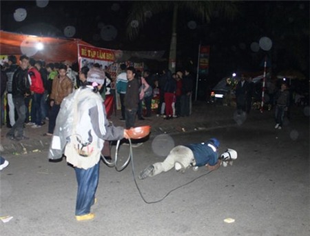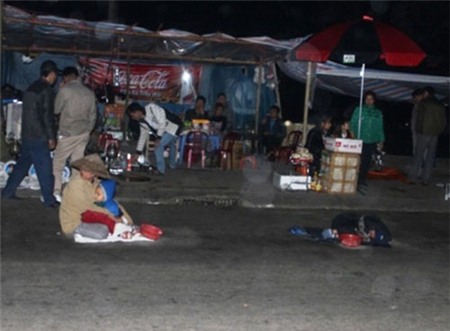 Ngồi, nằm ngay giữa lòng đường trước Đền Thiên Trường |