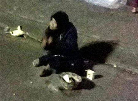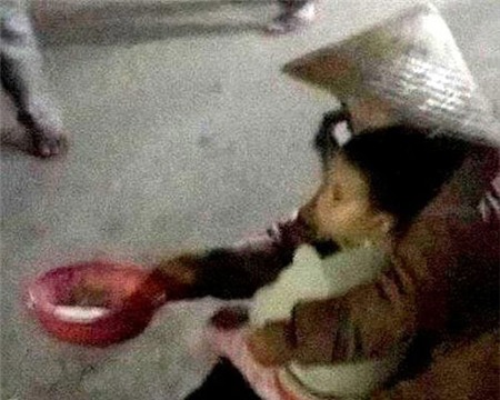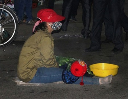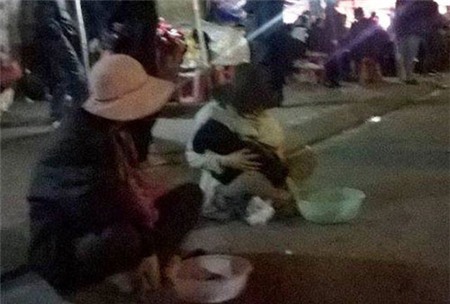 Người mẹ ngồi trông lòng thương của người qua lại, trong khi đó đứa con thì nằm sõng soài trong cái lạnh và mưa phùn |