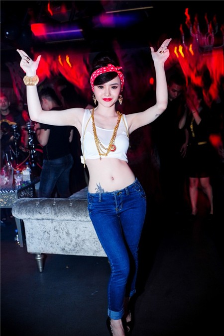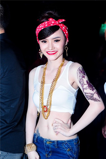 chiếc nơ trên đầu và những miếng dán hình xăm đều được Phương Trang bắt
