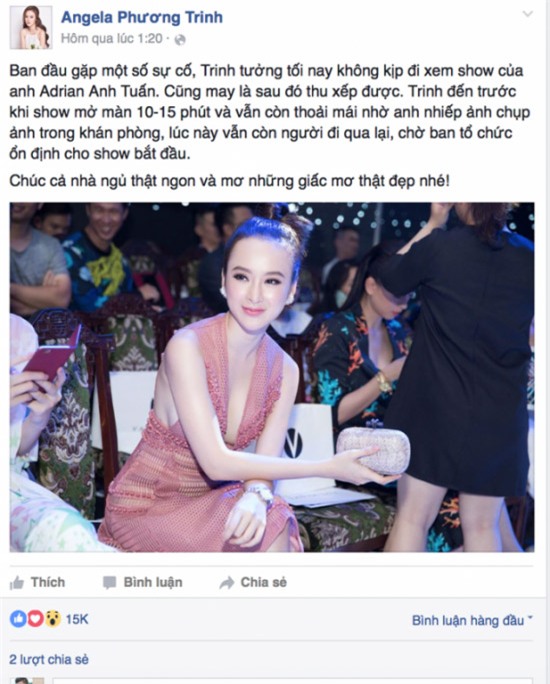 “Ban đầu gặp một số sự cố, Trinh tưởng tối nay không kịp đi xem show của anh Adrian Anh Tuấn. Cũng may là sau đó thu xếp được. Trinh đến trước khi show mở màn 10-15 phút và vẫn còn thoải mái nhờ anh nhiếp ảnh chụp ảnh trong khán phòng, lúc này vẫn còn người đi qua lại, chờ ban tổ chức ổn định cho show bắt đầu”, Angela Phương Trinh viết.