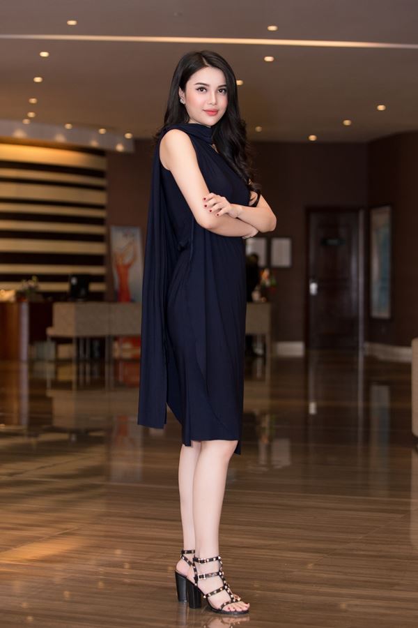 Á hậu Thư Dung trong thiết kế bất đối xứng của Đỗ Long. Màu đen huyền bí với những ánh kím lấp lánh mang tới vẻ ngoài quyền lực nhưng có chút huyền bí. Trong khi đó, những mảng màu họa tiết in hình lá phần thân trên thiết kế mang lại sự mới vẻ cho trang phục này. Để phong cách chỉn chu, Thư Dung mix đôi giày cao gót ánh kim màu bạc giúp chân cô như dài ra.