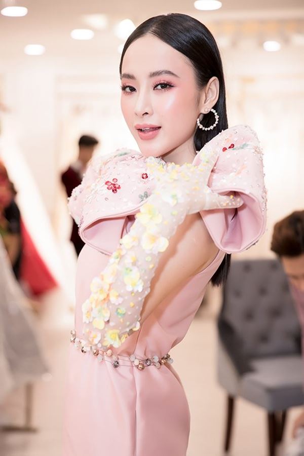 Màu pastel nhẹ nhàng nữ tính, tạo nên nét hiền dịu cho Angela Phương Trinh, khác xa với những bộ cánh cắt xẻ táo bạo, khoe body bốc lửa trước đó. Biến hóa đa dạng của nàng diễn viên luôn mang tới sự hưng phấn cho người hâm mộ. Đặc biệt cô nàng dùng găng tay đính hoa, một kiểu mốt đang khá hot hiện nay