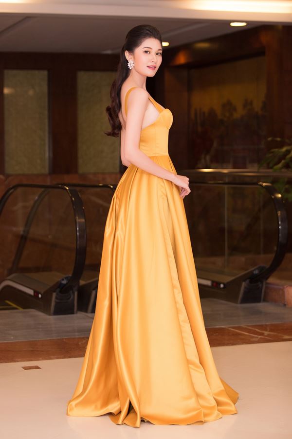 Á hậu Thùy Dung diện chiếc váy công chúa màu vàng nổi bật. Giữa dàn người đẹp, cá tính thời trang của Thùy Dung được thể hiện rõ, tuyên ngôn về vẻ đẹp mà cô hướng tới có chút cổ điển. Chi tiết chân váy xếp ly lớn cùng độ dài vừa vặn, giúp người đẹp tôn lên vóc dáng thay vì bị nhấn chìm.