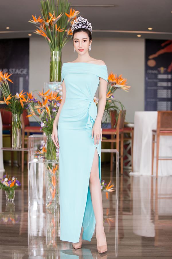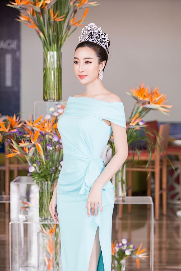 Đỗ Mỹ Linh trong thiết kế màu pastel dễ chịu của NTK Lê Thanh Hòa tại họp báo Hoa hậu Việt Nam 2018. Vẫn là phom dáng quen thuộc với những chiếc váy được đo ni đóng giày, xẻ đùi rập khuôn.... song, cô nàng ghi điểm bởi lựa chọn layout trang điểm - làm tóc phù hợp.