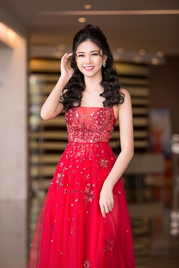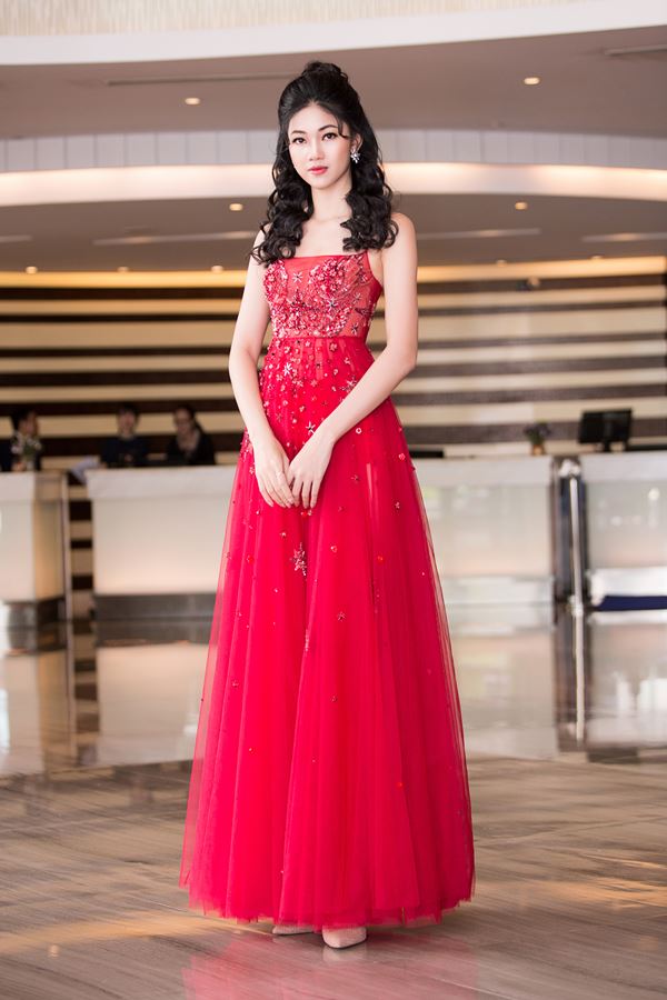 Á hậu Thanh Tú nổi bật với chiều cao, ưu thế để cô nàng thu hút mọi ánh nhìn. Chung công thức với chiếc đầm cổ điển của Á hậu Thùy Dung, nhưng Thanh Tú chọn chất liệu voan mềm mại, đính kết tỉ mỉ và cách làm tóc xoăn mì tôm.