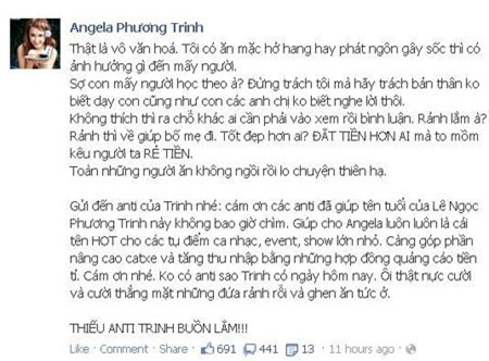 Có vẻ như không chịu nổi sự chỉ trích của dư luận, Phương Trinh đã đáp trả lại bằng việc đăng một status rất dài và gay gắt trên trang cá nhân. "Bà mẹ nhí" không chỉ lớn tiếng trả đũa anti-fan mà còn đanh đá lôi cả các bậc phu huynh ra để phê phán. Khá nhiều người thấy choáng váng khi đọc được nội dung status và cảm nhận được thái độ "ngông cuồng" của chủ nhân facebook này.