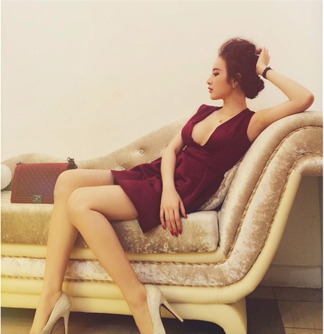Cô nàng tạo dáng trên ghế sofa để chụp hình.