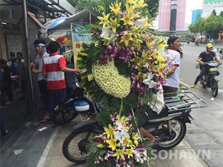 Chiều qua (9/5), khi linh cữu của Duy Nhân đã rời nhà tang lễ tại chùa Vĩnh Nghiêm thì vòng hoa viếng của Angela Phương Trinh mới được chuyển đến khiến nhiều người có mặt bất ngờ.