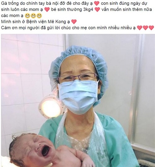 Facebooker Huynh Le viết: “Gà trống do chính tay bà nội đỡ đẻ cho đây. Con sinh đúng ngày dự sinh luôn. Bé sinh thường 3kg4. Vẫn muốn sinh thêm nữa các mom ạ. Mình sinh ở Bệnh viện Mê Kong. Cảm ơn mọi người đã gửi lời chúc cho mẹ con mình nhiều nhiều!”
