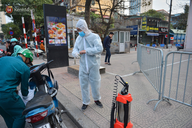 Sau khi phong toả, lực lượng chức năng cũng phun khử khuẩn phía bên ngoài ngân hàng này để tránh dịch bệnh lây lan