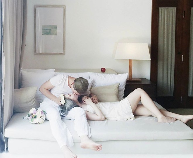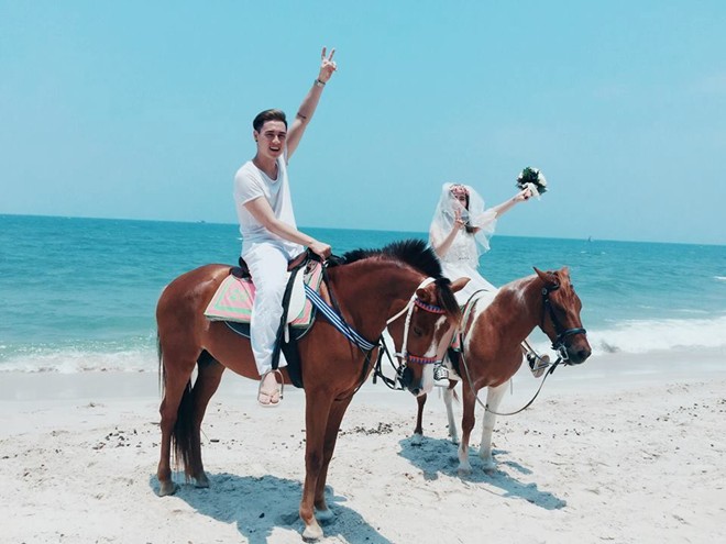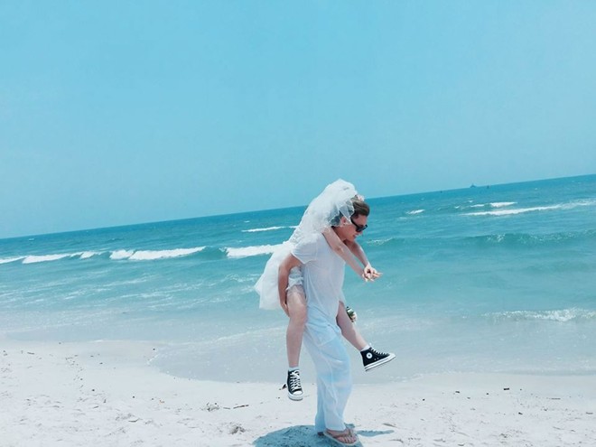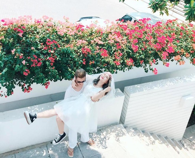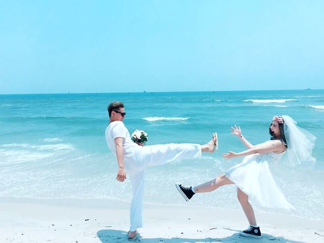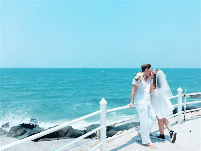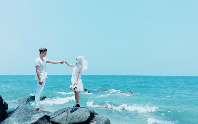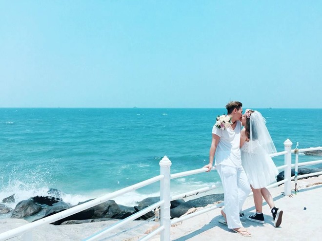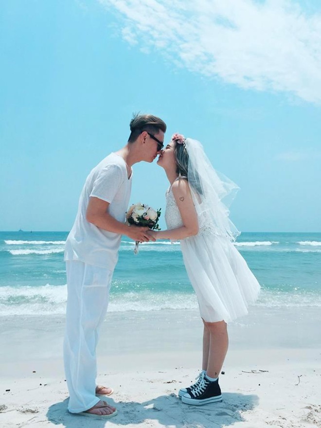 | Vào ngày 23/5, cả hai tiếp tục thu hút sự chú ý của fan khi đăng tải bộ ảnh cưới lãng mạn tại Thái Lan. Trang phục cặp đôi Hà thành lựa chọn dựa trên tông màu trắng. Trong khi Kiên Hoàng mặc đồ đơn giản, Heo Mi Nhon lại phá cách với giày thể thao kết hợp cùng váy cô dâu. |