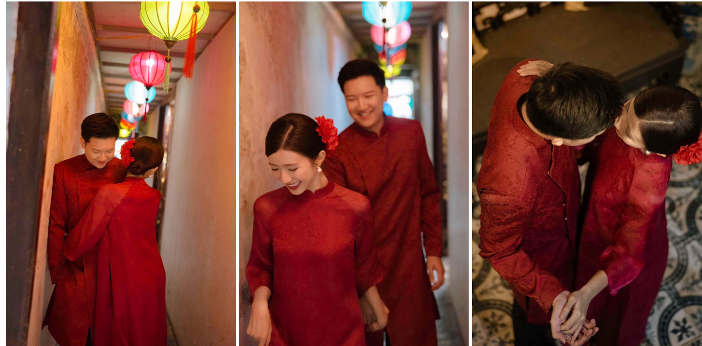 Nữ diễn viên chọn áo dài sắc đỏ rực rỡ, kết hợp giày và phụ kiện hoa cài tóc cùng màu. Chú rể cũng mặc trang phục đồng điệu. Nhiều đồng nghiệp như Lan Phương, Hương Giang, Huyền Lizzie… gửi lời chúc mừng nữ diễn viên.