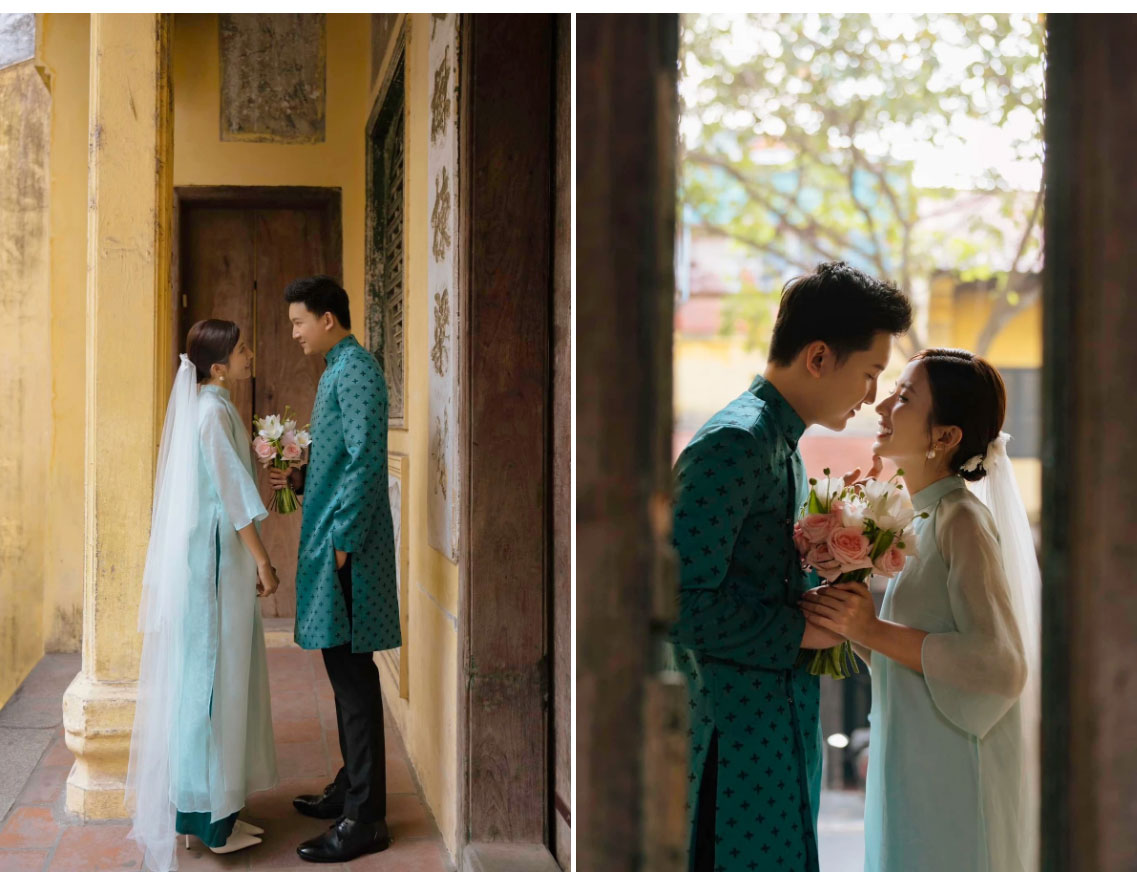 Ngọc Huyền cũng chụp thêm bộ hình với trang phục áo dài xanh, kiểu tóc, trang điểm khá nhẹ nhàng, đơn giản. Nữ diễn viên vẫn chọn bối cảnh khu phố cổ để lưu lại khoảnh khắc đáng nhớ nhất bên chú rể. Ngọc Huyền tâm sự cô cảm thấy may mắn khi luôn được chồng cũng như hai bên gia đình thấu hiểu và ủng hộ cho công việc diễn xuất. Ảnh: Xéo Xọ.
