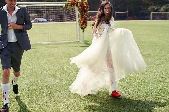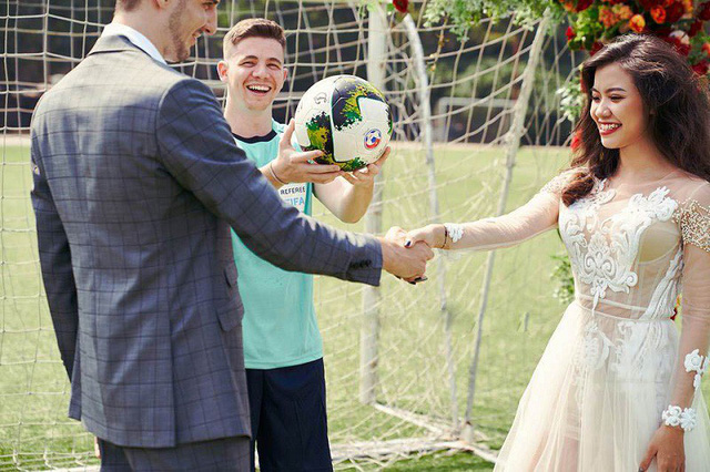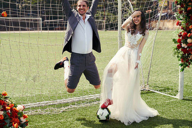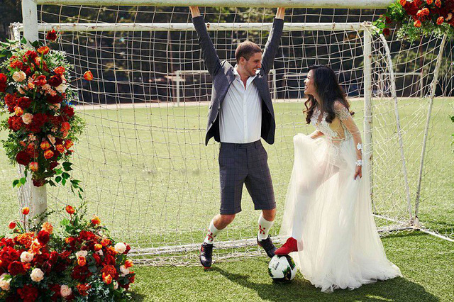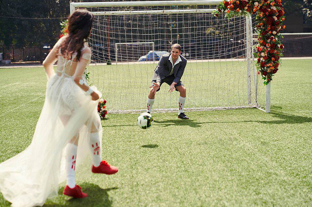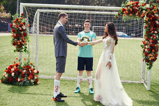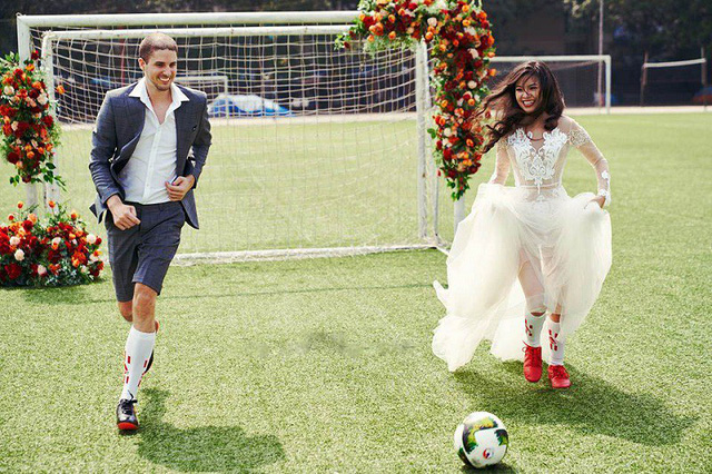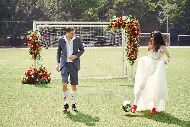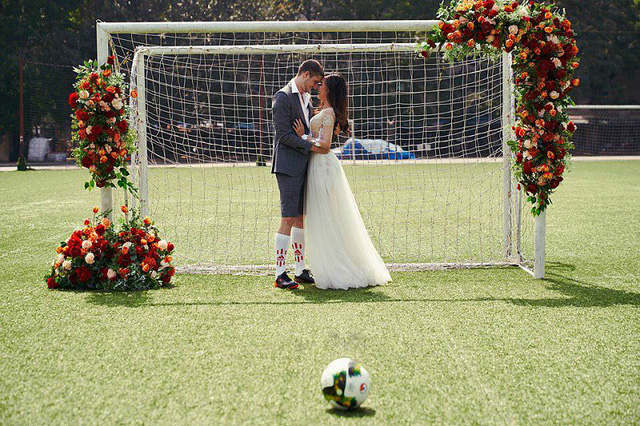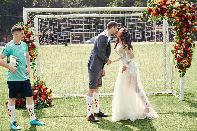 Trong trang phục cô dâu chú rể, cặp đôi chọn giày thể thao, tất đá bóng để làm phụ kiện và địa điểm chụp hình là một sân bóng được trang trí nhiều hoa.