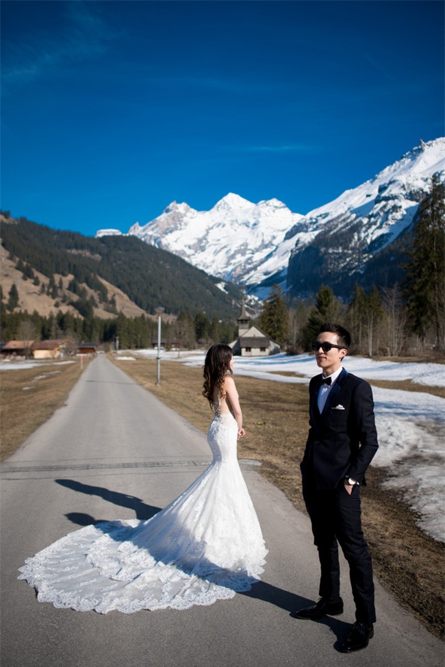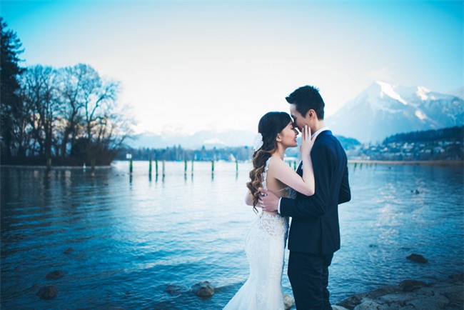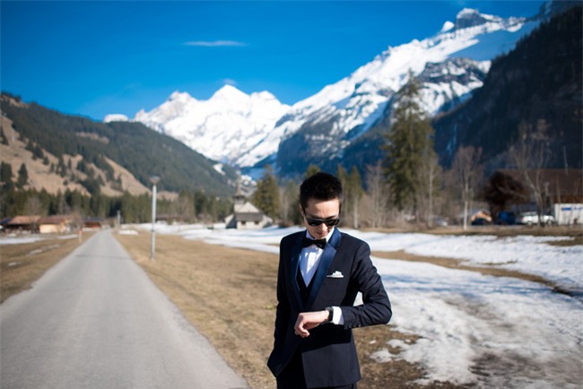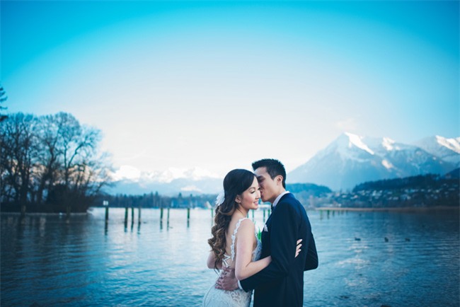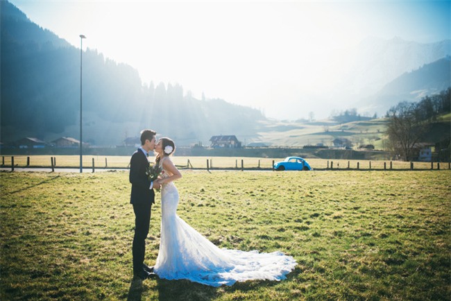 Bộ ảnh cưới của cặp đôi còn thấp thoáng hình bóng dãy núi trắng Alpes hùng vĩ với đỉnh núi phủ đầy tuyết trắng, nơi được mệnh danh là "con rồng châu Âu".