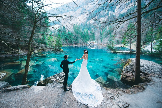 Cặp đôi chụp ảnh tại hồ xanh Blausee - địa danh nổi tiếng với nước hồ tự nhiên trong xanh như ngọc, bỏ xa cả "thiên đường" Maldives về độ long lanh, mát mắt.