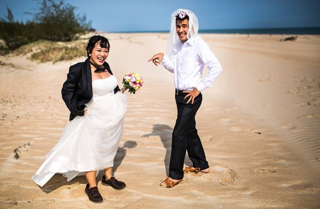 Trong trang phục áo cưới, đôi vợ chồng trẻ vẫn tạo dáng hài hước khi hoán đổi phụ kiện.