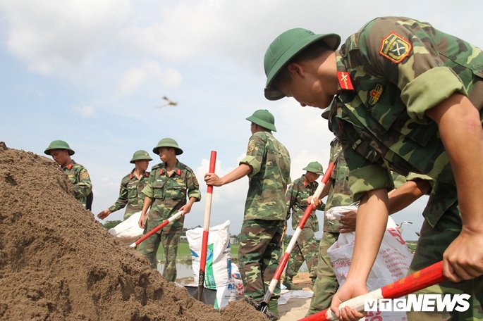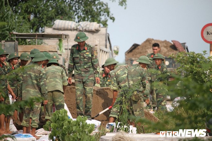 Trước tình hình trên, hàng trăm chiến sĩ cùng người dân xã Thanh Bình được huy động đắp bao cát ngăn nước tràn đê.