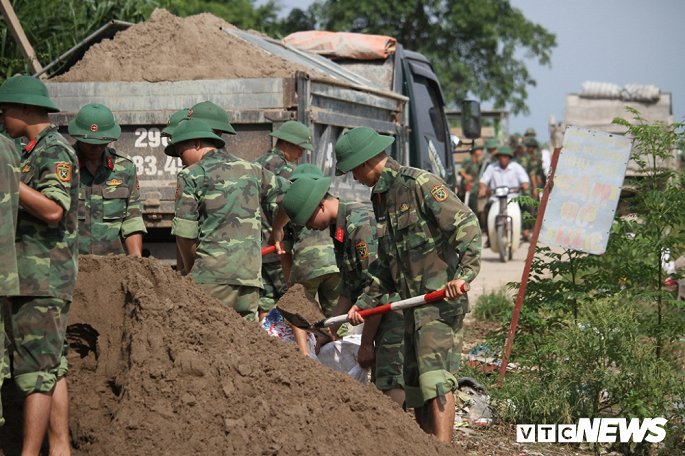 Từ đêm 29, rạng sáng 30/7, hàng trăm người dân cùng bộ đội được huy động để ngăn nước tràn đê sông Bùi, đoạn qua xã Thanh Bình, huyện Chương Mỹ, Hà Nội.