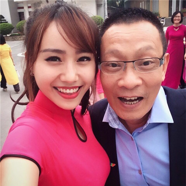 Xuân Anh cười rạng rỡ bên nhà báo Lại Văn Sâm. Cô tâm sự đây là người mà cô yêu mến và kính trọng từ khi còn bé.