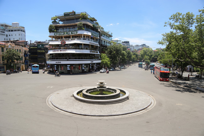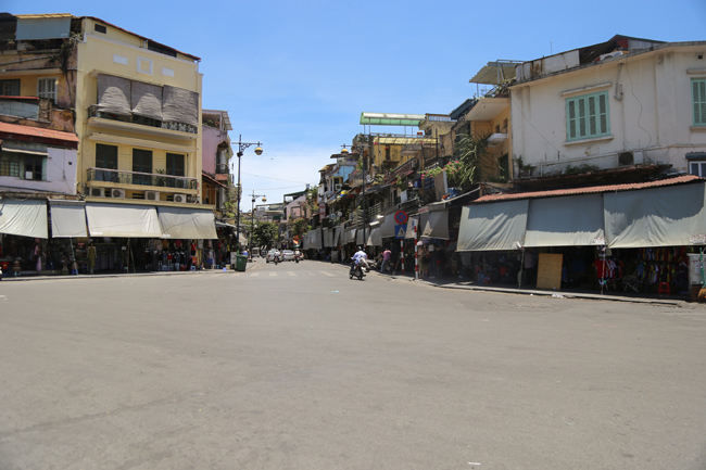 Kể cả tuyến phố trung tâm khu vực ven hồ Gươm vốn ngày đêm đều đông đúc người buôn bán và khách du lịch cũng trở nên thưa vắng. Hàng quán đồng loạt phủ bạt che kín mặt tiền, yên ắng dưới nắng trưa.
