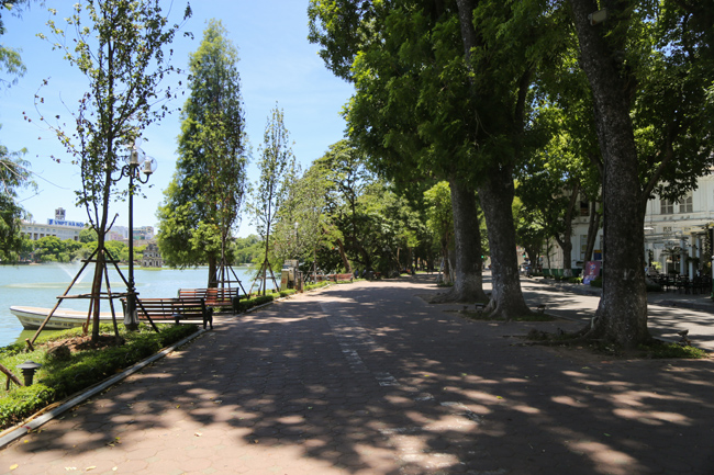 Phần vỉa hè cho người đi bộ ven bờ hồ thường ngày đông đúc du khách nay cũng đìu hiu dù luôn rợp bóng cây xanh.