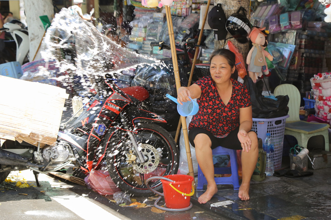 Ở khu vực phố cổ, chủ các cửa hàng cũng như hộ dân liên tục dội nước ra trước cửa, cố làm dịu đi cái nóng của mặt đường nhựa.