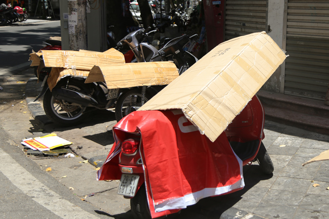 Xe máy dựng trên vỉa hè được người dân che đậy kín bằng bìa các-tông, phông bạt, áo mưa…