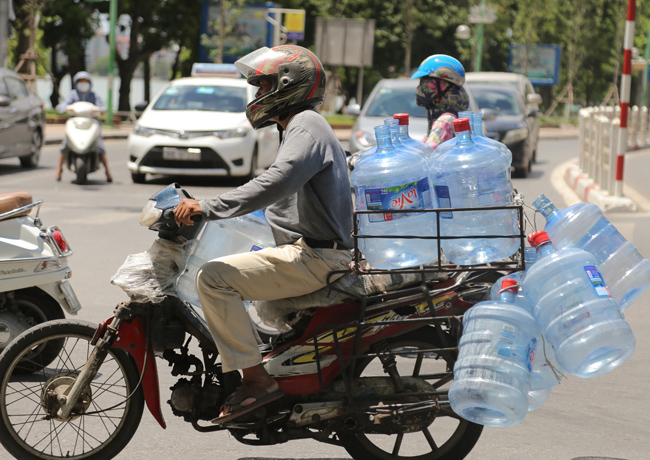 Những ngày này, người vận chuyển nước luôn tất bật. Đi trên đường không khó để bặt gặp những chiếc xe máy chở đầy những bình nước tinh khiết lao đi vội vã.