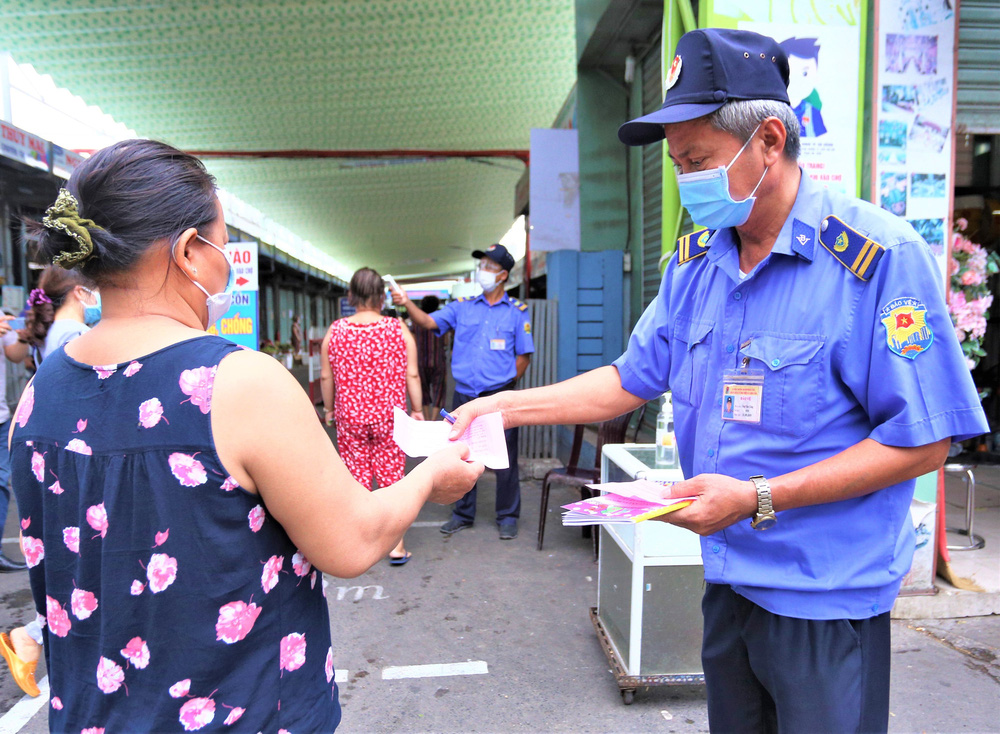 Bảo vệ chợ ghi vào thẻ thông tin của người đi chợ, giúp quá trình truy vết sau này dễ dàng hơn nếu xảy ra trường hợp phát hiện ca nghi nhiễm Covid-19 tại chợ.