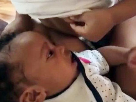 Khoảnh khắc cậu bé loay hoay vặch ti cho em bú. Ảnh cắt từ clip.