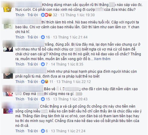 "Chỉ có những người phụ nữ mất đi lòng tự trọng mới bước chân vào gia đình của người khác, phá vỡ tan nát gia đình người ta như vậy còn giả bộ nhịn ăn truyền nước, kể khổ cho ai nghe? Lúc dắt tay chồng người ta đi ngoài đường có hiểu cô vợ ở nhà đau đến thế nào không? Thiếu lòng tự trọng, mất hết nhân phẩm đàn bà, xấu xa, mất nết".
