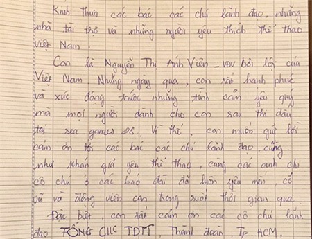 Bức thư có đoạn: “Những ngày qua, con rất hạnh phúc và xúc động trước những tình cảm yêu quý mà mọi người đã giành cho con sau đợt thi đấu tại SEA Games 28. Vì thế, con muốn gửi lời cám ơn đến các chú, các bác lãnh đạo, những khán giả yêu thể thao, cùng các anh chị, cô chú ở các báo đài đã luôn yêu mến, cổ vũ và động viên con trong suốt thời gian qua”.