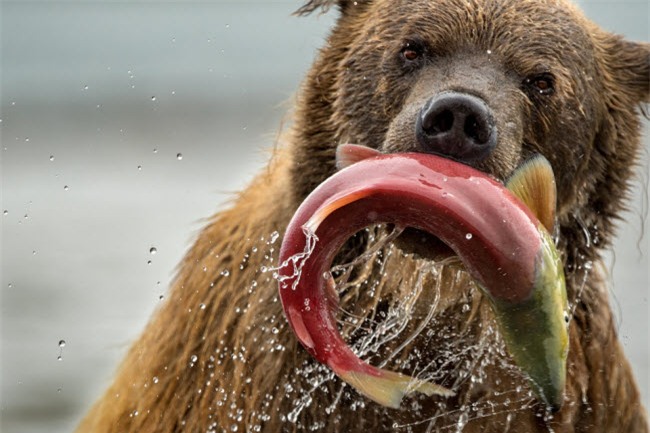 Khoảnh khắc gấu nâu vui mừng sau khi bắt được một con cá hồi dưới hồ Kuril ở Kamchatka, Nga. Ảnh: Roie Galitz