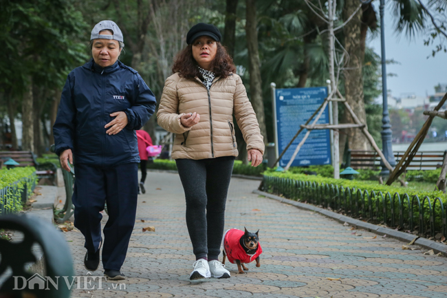 Trời có gió rét, người dân ra đường phải khoác nhiều lớp áo dày, đội mũ, quàng khăn kín cổ... Những chú cún cưng cũng được chủ mặc cho một chiếc áo nhỏ.