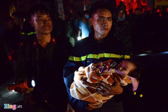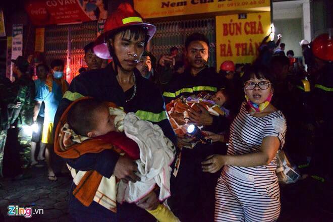 Cảnh sát PCCC ôm ghì một trẻ nhỏ để tránh khói đưa ra ngoài: Ảnh: Zing
