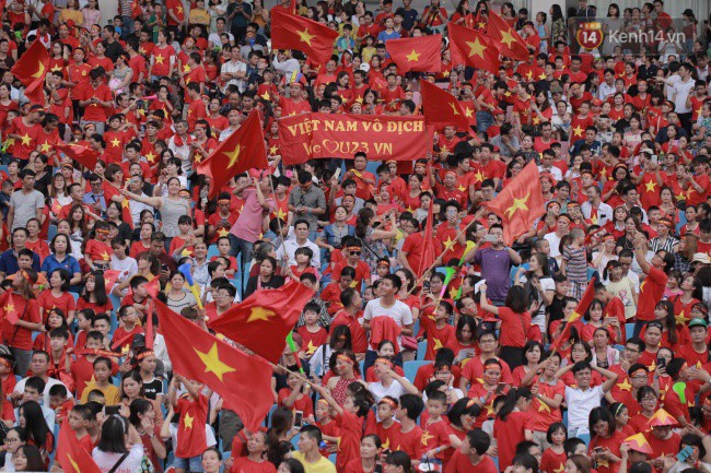 Hàng nghìn cổ động viên có mặt trên khán đài của sân vận động Mỹ Đình reo hò khi tuyển thủ Olympic Việt Nam xuống sân