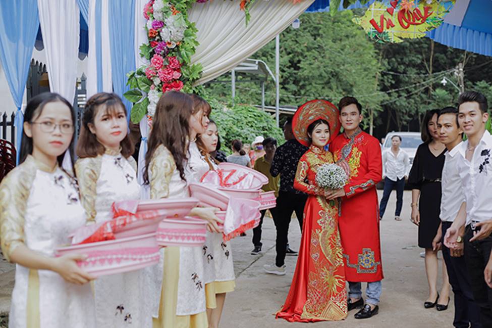 Sau hoàn thành các nghi lễ, cô dâu - chú rể đến một nhà hàng gần nhà để đãi tiệc.