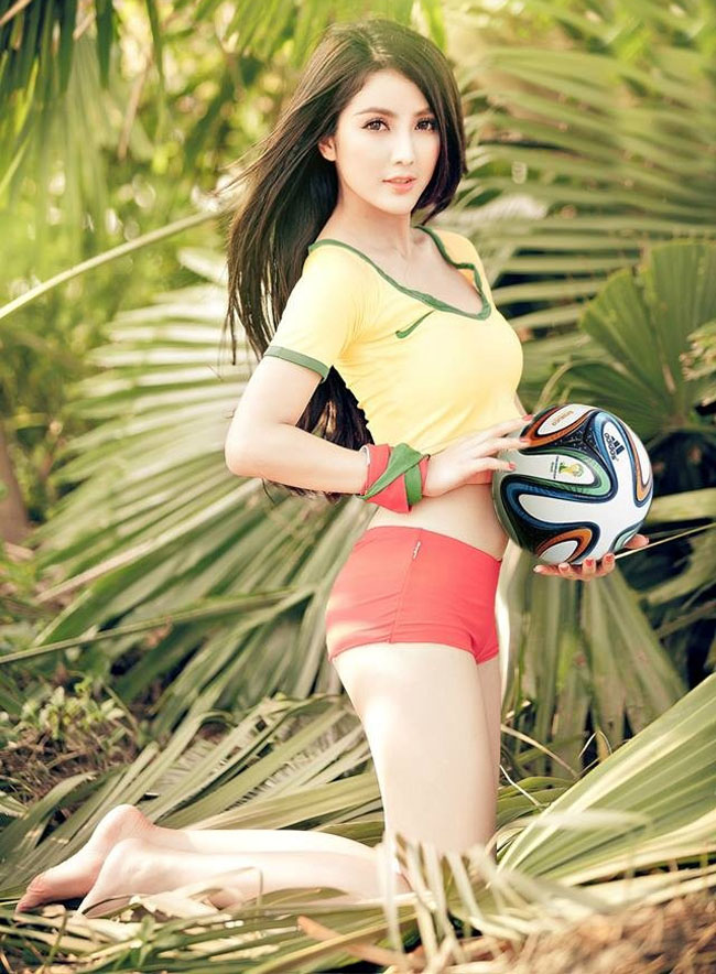 Mỹ nữ Việt mặc trang phục gợi cảm cổ vũ World Cup. Trong đó, Nữ hoàng trang sức Phương Chi quyết định bán nude, dự định sẽ đi bão đêm nếu Đức tiếp tục vô địch.