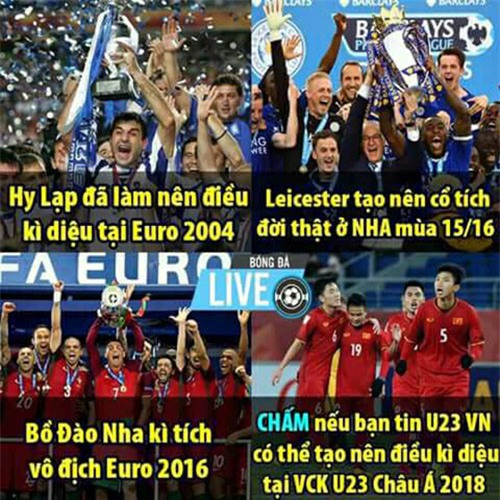 | Trước khi giải đấu diễn ra, nhiều người cho rằng U23 Việt Nam chỉ là đội lót đường. Những kỳ tích đã diễn ra, câu chuyện cổ tích sẽ được viết tiếp hồi kết. Người hâm mộ kỳ vọng Việt Nam sẽ làm được điều tương tự như Hy Lạp, Bồ Đào Nha hay Leicester đã làm. Ảnh: Live Bóng đá. |
