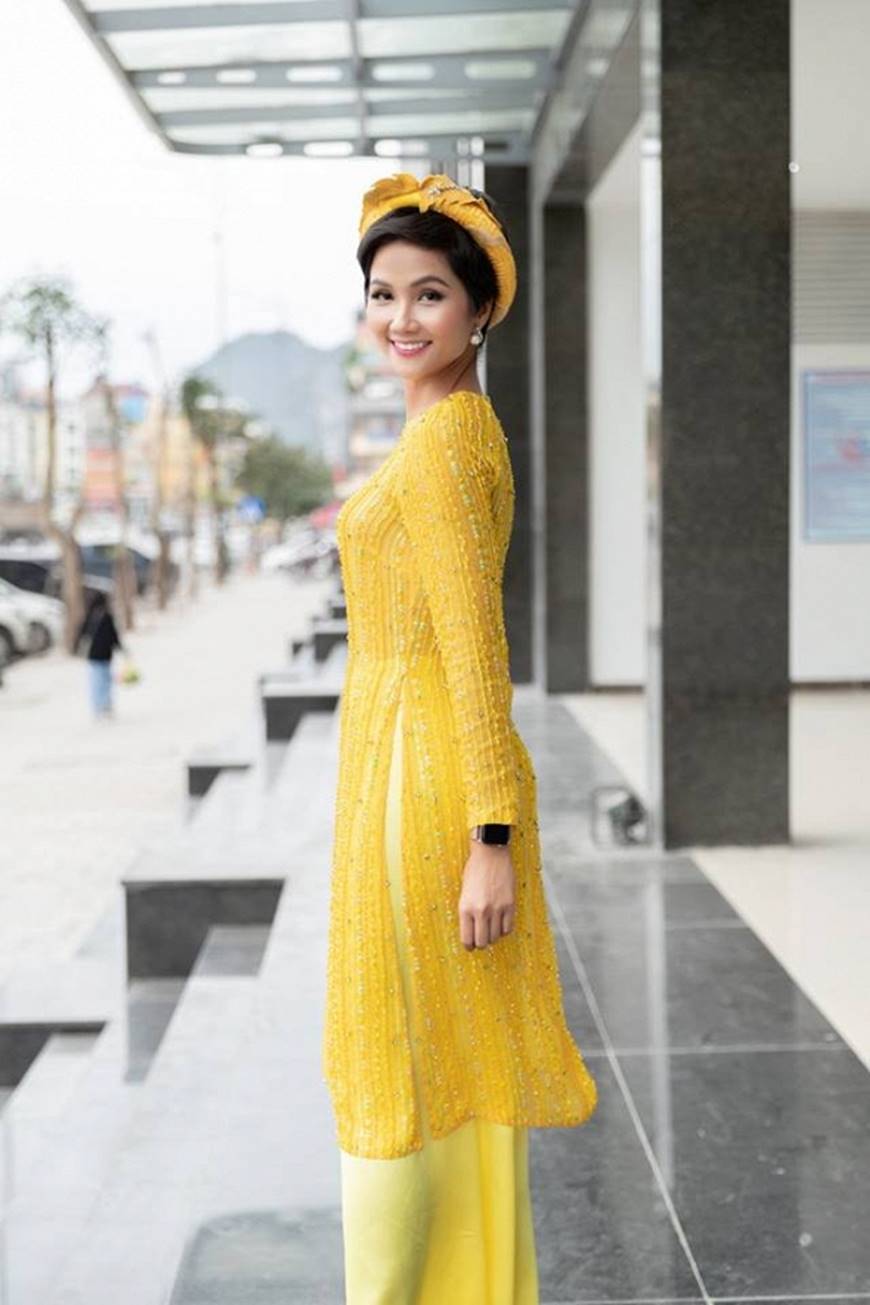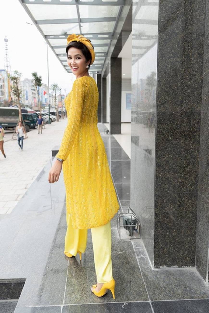 Thiết kế áo dài gam vàng được thêu và đính kết tỉ mỉ ôm đường cong mỹ miều, H'Hen Niê lại khiến dân tình xao xuyến trước nhan sắc đương độ thanh xuân, rực rỡ nhất.