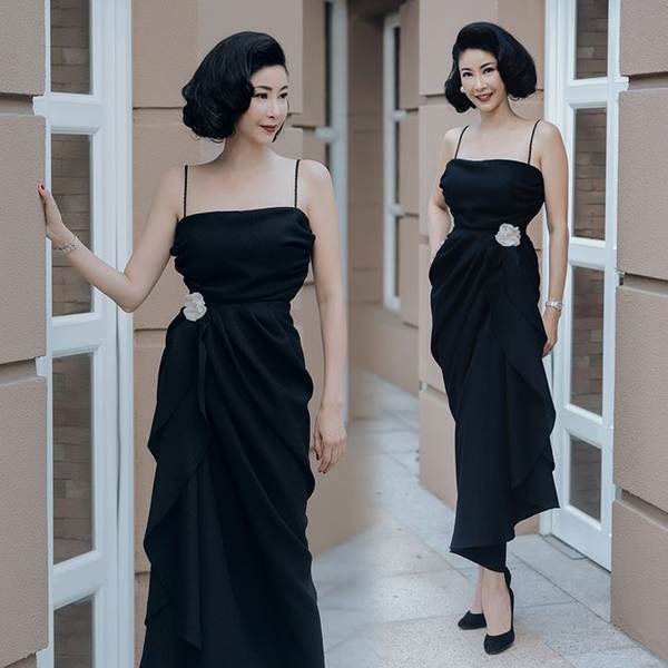 Hoa hậu Việt Nam 1992 Hà Kiều Anh “ăn gian” tổi thật khi diện chiếc đầm hai dây cúp ngực với chân váy xẻ sâu. Phần thắt eo váy được điểm xuyết bằng bông hoa có màu sắc tương phản tạo điểm nhấn nhẹ nhàng.