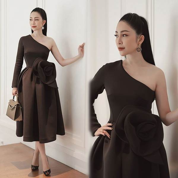 Diễm My diện chân váy thiết kế bất đối xứng với chiếc áo dáng rộng mang lại vẻ ngoài hiện đại, lạ mắt. Bộ cánh được điểm xuyết thêm bằng bông hoa màu trắng trước ngực tạo nên sự tương phản.