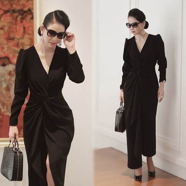 Người đẹp Thuỷ Hương diện chiếc đầm dài không hoạ tiết được tạo điểm nhấn bằng đường xẻ ngực và xẻ tà chừng mực.