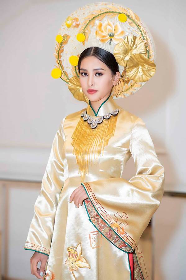 Tiểu Vy đảm nhận vị trí vedette với áo dài màu vàng – tựa trưng cho Hoàng tộc.