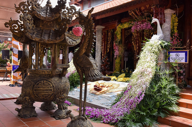 Phía cổng vào điện chính được bài trí bằng hoa tươi.